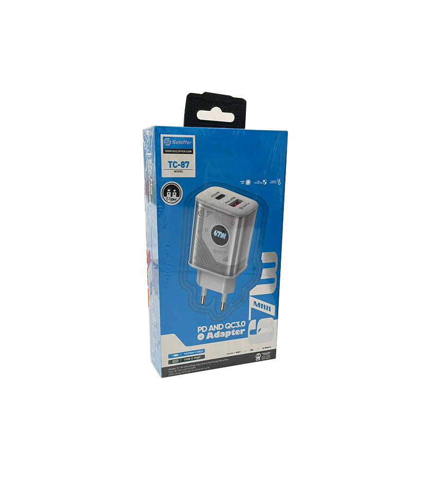 آداپتور شارژر Soloffer TC-87 با توان خروجی 67 وات یکی از شارژرهای سریع و قدرتمند موجود در بازار است. این شارژر با توان بالای خود قادر است چندین دستگاه را به طور همزمان شارژ کرده و نیازهای شارژ روزانه شما را به راحتی برآورده کند. با توان 67 وات، میتوانید دستگاههایی مانند گوشیهای هوشمند، تبلتها، لپتاپها و سایر گجتها را با سرعت بالا شارژ کنید. این ویژگی بهویژه برای افرادی که نیاز دارند در کمترین زمان ممکن دستگاههای خود را شارژ کنند، یک مزیت بزرگ به حساب میآید.